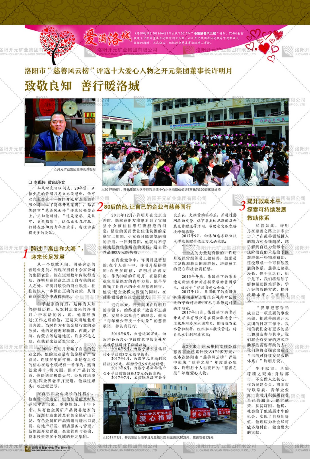 洛陽開元礦業(yè)集團(tuán)有限公司簡介洛陽開元礦業(yè)集團(tuán)有限公司,始成立于2006年,位于洛陽市開元大道269號。集團(tuán)旗下共有五余家全資子公司,業(yè)務(wù)涉及有色金屬礦山開發(fā)、礦產(chǎn)品購銷與進(jìn)出口貿(mào)易、房地產(chǎn)開發(fā)、文化藝術(shù)、企業(yè)管理與咨詢、資本投資等多個(gè)領(lǐng)域。民建河南省委委員、民建河南省委企業(yè)委副主任、民建洛陽市委委員、企業(yè)委主任、洛陽民建企業(yè)家協(xié)會(huì)會(huì)長許明月是公司創(chuàng)始人,現(xiàn)任洛陽開元礦業(yè)集團(tuán)有限公司董事長。在礦業(yè)領(lǐng)域,洛陽開元礦業(yè)集團(tuán)擁有多家實(shí)力雄厚的子公司:貴州開元礦業(yè)有限公司探、采礦權(quán)面積共11.33平方公里;興??h銅鑫礦業(yè)有限公司探礦權(quán)面積8.76平方公里,礦山資源潛力巨大;2021年,開元集團(tuán)與盧氏中科礦業(yè)有限公司開展戰(zhàn)略合作。盧氏中科礦業(yè)有限公司專注于有色金屬的浮選、加工和銷售,擁有強(qiáng)大的技術(shù)支撐平臺(tái),是集探、采、選、冶、研為一體的中大型綜合礦業(yè)企業(yè)。目前,盧氏中科王家河1000噸選礦廠已成功投產(chǎn),雙河金礦、柳關(guān)欒盧鉛鋅礦相繼順利開工,樓房銀礦與圪老灣鉛鋅礦的深部探礦重大突破,標(biāo)志著礦山版圖取得重大進(jìn)展,為開元集團(tuán)后續(xù)發(fā)展奠定了堅(jiān)實(shí)基礎(chǔ)。在文化傳媒領(lǐng)域,洛陽市明月美術(shù)館通過豐富多樣的藝術(shù)展覽、學(xué)術(shù)研討和公共教育活動(dòng),努力打造一個(gè)集展覽、交流、教育、研究為一體的綜合性藝術(shù)平臺(tái)。此外,在金融投資領(lǐng)域,開元集團(tuán)旗下的北京明峰資本管理有限公司專注于投資具有高增長潛力的優(yōu)秀企業(yè),特別是高科技、新能源、環(huán)保等新興產(chǎn)業(yè),為客戶提供個(gè)性化的資產(chǎn)配置服務(wù)。在做好企業(yè)經(jīng)營的同時(shí),開元集團(tuán)始終不忘企業(yè)的社會(huì)責(zé)任和家國情懷,以突出的愛心公益事跡,開展了一系列公益慈善活動(dòng):“民建林”公益事業(yè)通過“思源基金”“幫幫公益”線上公益平臺(tái),與眾多愛心人士籌措資金20余萬元;資助541名貧困大學(xué)生共計(jì)270余萬元,推進(jìn)“數(shù)字助力——河南AI人才培養(yǎng)”;捐款10萬元,馳援京津冀、黑龍江洪水地質(zhì)災(zāi)害……公司于2017年底被洛陽市慈善總會(huì)評為“洛陽慈善風(fēng)云榜——十大愛心集體”。洛陽開元礦業(yè)集團(tuán)有限公司秉承持續(xù)發(fā)展理念,憑借多年來良好的企業(yè)信譽(yù)與經(jīng)營業(yè)績,與全國多家企業(yè)建立了良好合作關(guān)系,受到社會(huì)各界的一致好評,多次榮獲“納稅標(biāo)兵”“先進(jìn)企業(yè)”“招商引資模范企業(yè)”等榮譽(yù)稱號?;赝麃頃r(shí)路,開元人勠力同心,以“闖”的精神和“創(chuàng)”的勁頭,一路披荊斬棘,踏過千山萬水;展望新未來,開元人凝心聚力,不執(zhí)于“舊”,無畏于“新”,秉承“勇于跨越,追求卓越”的企業(yè)精神,乘著國家高質(zhì)量發(fā)展新征程的東風(fēng),跨過高山,越過大海,向著集團(tuán)多元化、國際化的目標(biāo),逐夢遠(yuǎn)航,跨越前行!