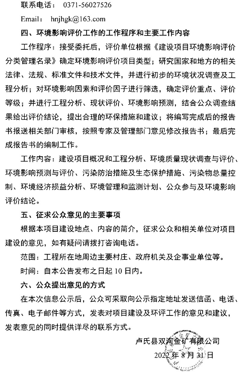 盧氏縣雙河金礦有限公司礦產(chǎn)資源開采項(xiàng)目環(huán)境影響評(píng)價(jià)公眾參與***次公示